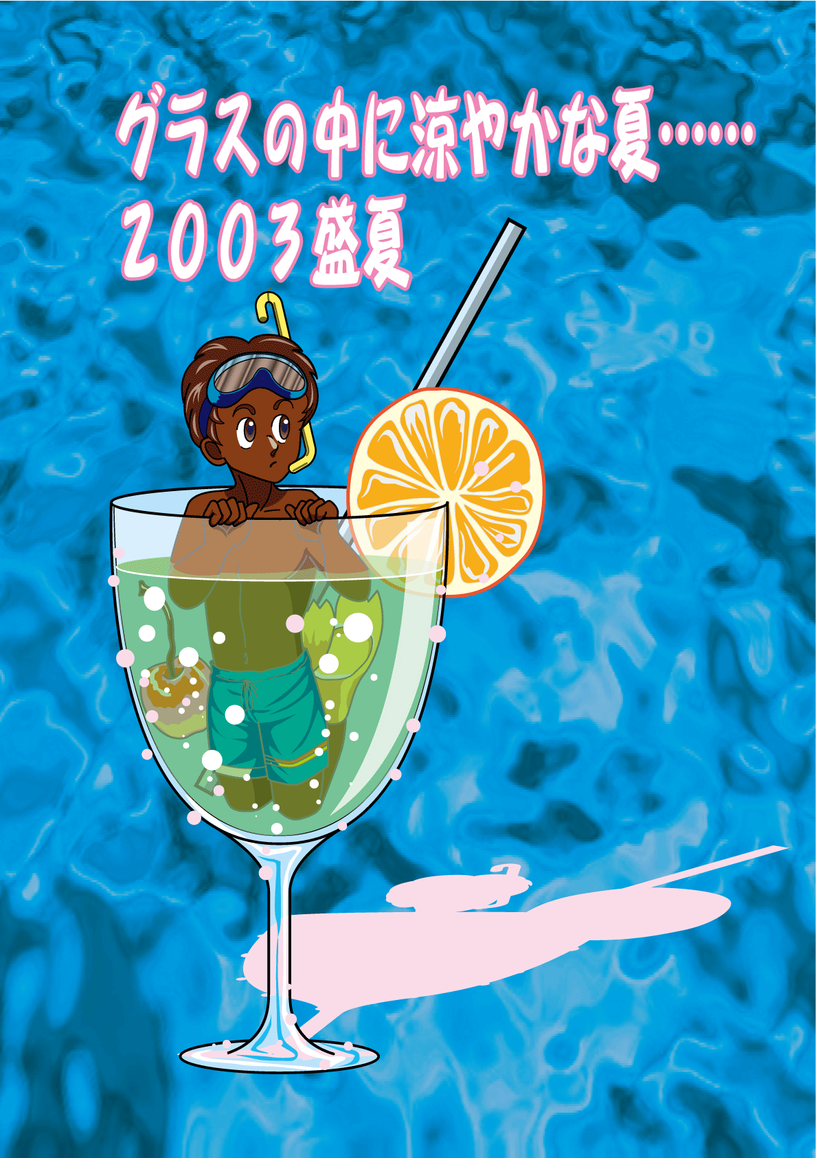 某サイトさんに差し上げた暑中見舞いのイラストです。 小学生の時に見た「何か」のイラストを再現したものです。 少年ではなくて「子豚」だったような気が・・・・。 前回イラスト、スィレネート使用したバックと同じですね。