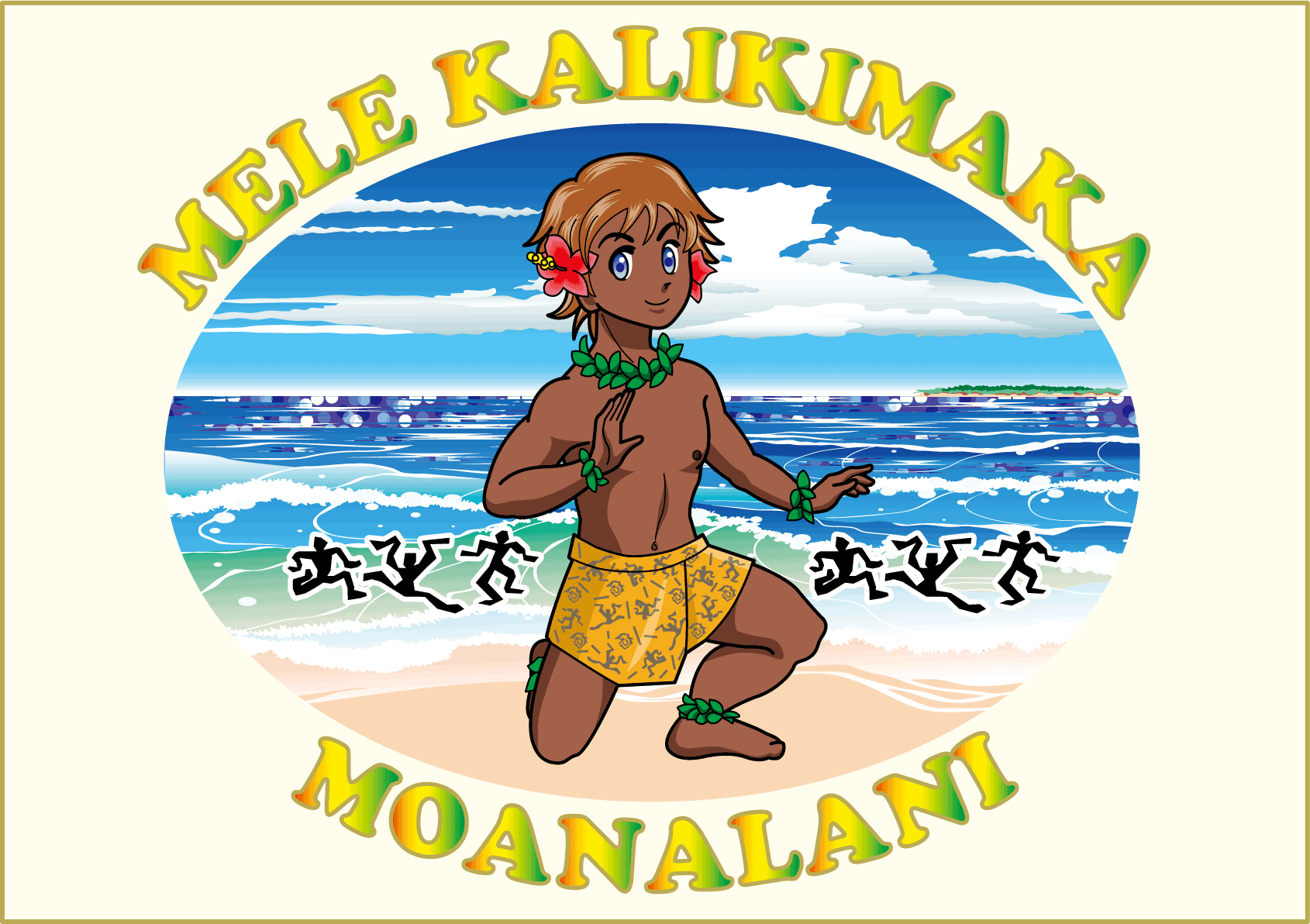 メレカリキマカ・モアナラニ と読みます。 メレカリキマカはメリークリスマス、モアナラニは海の天使という意味です。