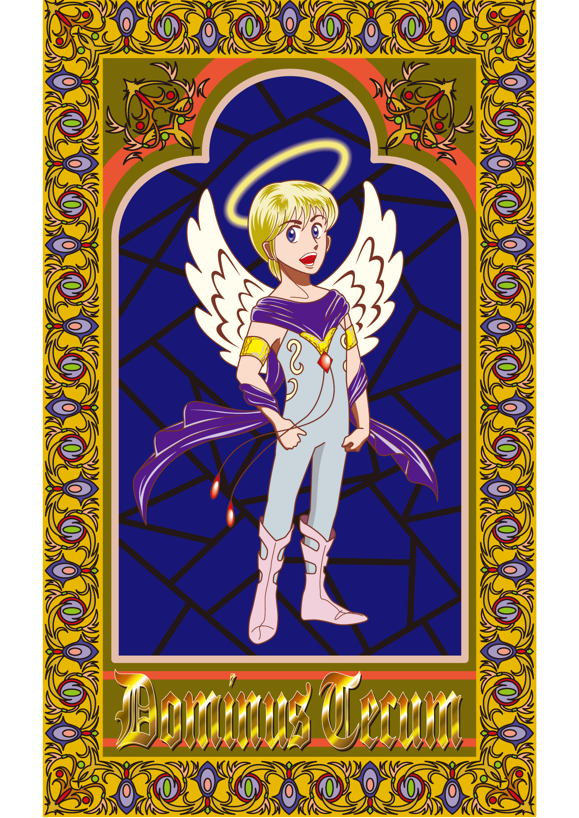 ドミヌス(主は) テクム(あなたとともに) 賛美歌の一部です。 ステンドグラス風に少年天使を仕上げてみました。 このイラストで一番手が掛かったのが回りの枠だったりして。