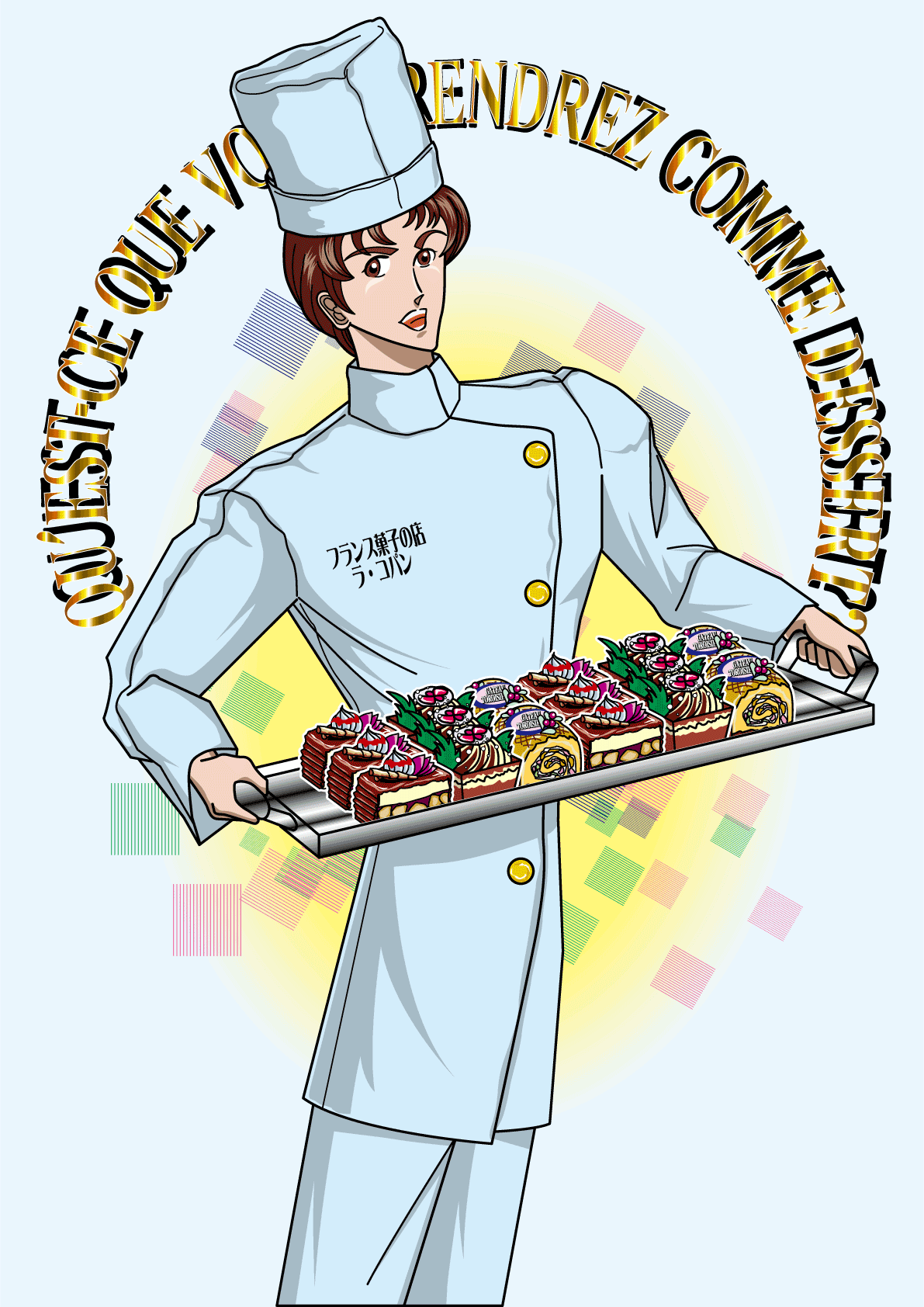 近所に美味しいケーキ屋さんがあって、そこのスタッフをイメージして描きました。 何故か私はそのお店の常連になってしまって・・・・行く度にいろいろおまけしてもらって・・・。 喫茶すればケーキが1個おまけ、ケーキを買えば1個おまけ、うれしいけどダイエットが・・・・。