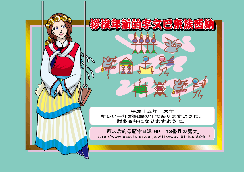 今年は東巴(トンパ)文字の年賀状にしました! しかし読めません! そして、羊を表す文字が見つからなくて山羊で代用しました。 あしからず!